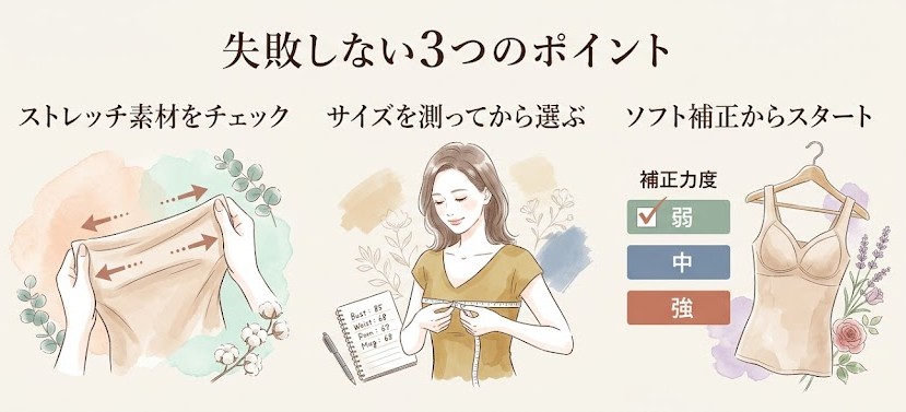 - 選ぶときはストレッチ素材・正確なサイズ・ソフト補正スタートの3点が基本