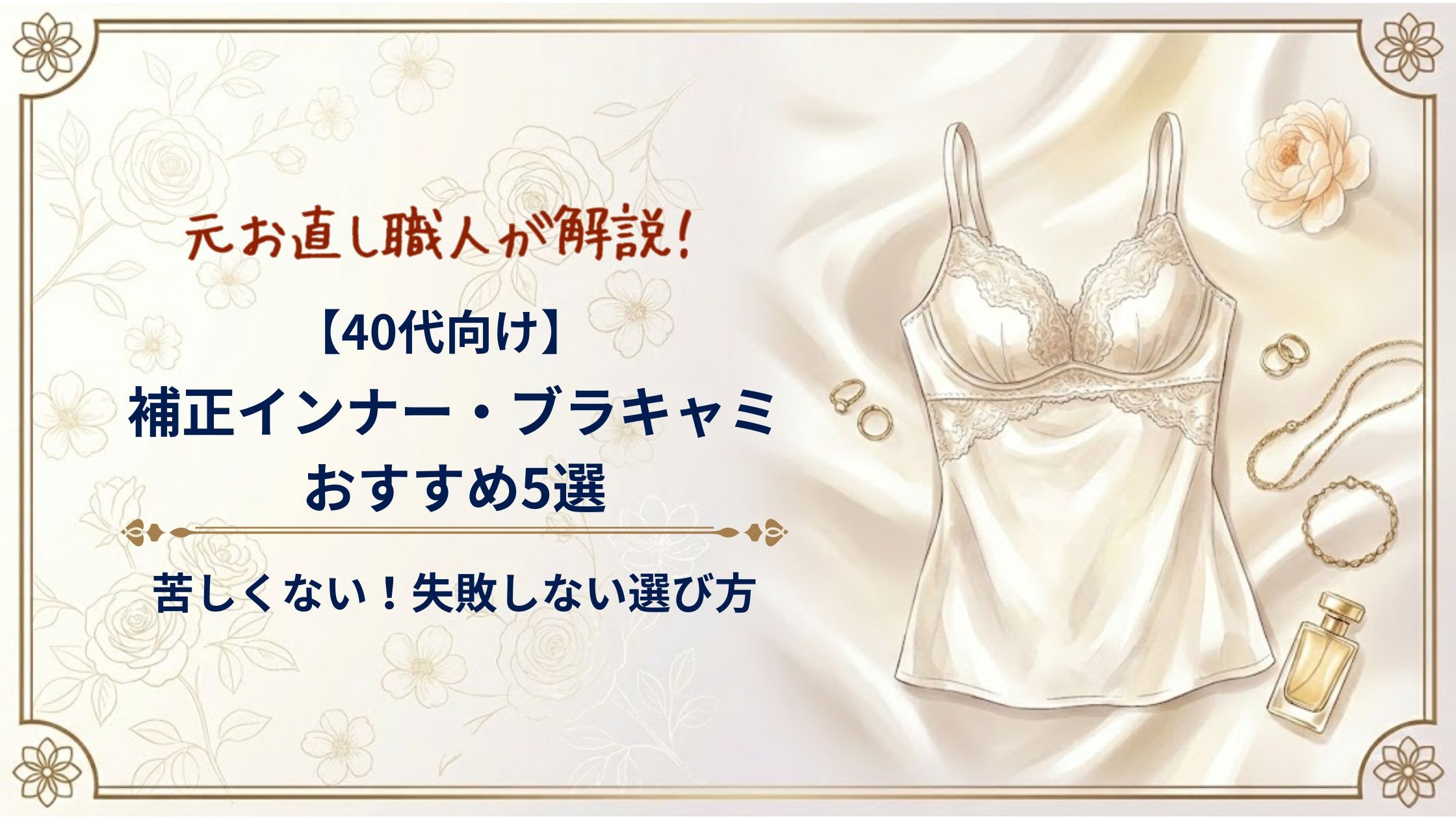 補正ブラキャミは、ブラジャーとキャミソールが一体になった補正インナーで、1枚で脇・背中・ウエストまでまとめてカバーできます。私は元お直し職人のまちです。洋服のお直しやオーダーメイドのアドバイザーとして多くのお客様の体型変化の相談を受けてきた経験から、40代に合う補正ブラキャミの選び方とおすすめ5選をお伝えします。