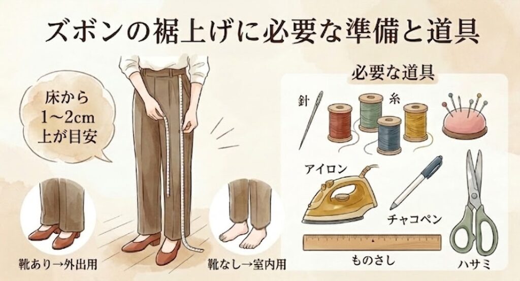 裾上げを始める前に、仕上がりの長さを決めて、必要な道具をそろえておきましょう。ここをきちんとやっておくと、あとの作業がぐっと楽になります。