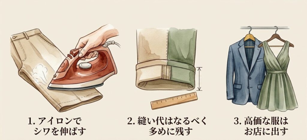 裾上げの手順がわかったら、次は失敗を防ぐコツを押さえておきましょう。お直しの現場で見てきた経験から、とくに大事なポイントを3つお伝えします。