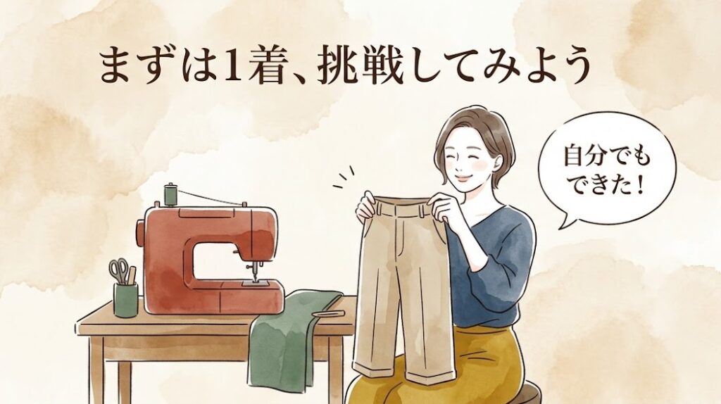 まずは1着、裾上げに挑戦してみてください。やってみると「自分でもできるんだ」とわかるはずです。